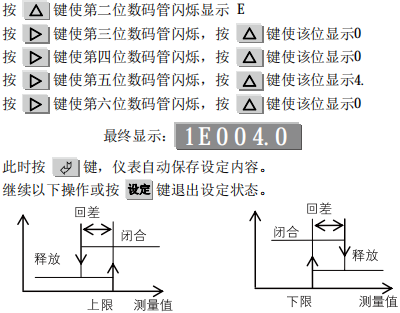 小長圖有紙記錄儀上下限報(bào)警繼電器的觸點(diǎn)是給用戶聯(lián)接相應(yīng)的控制電器[如電 磁閥]以組成控制系統(tǒng)時(shí)使用。為了防止在報(bào)警點(diǎn)附近繼電器觸點(diǎn)產(chǎn)生抖 動(dòng)現(xiàn)象,儀表采用設(shè)定回差的方法,以消除繼電器觸點(diǎn)抖動(dòng)。其提示符是:E