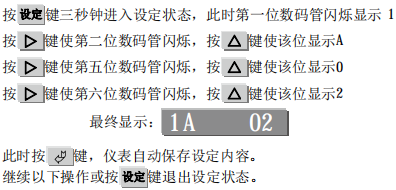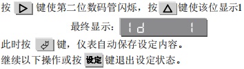 小數(shù)點(diǎn)位置的提示符是:d,在設(shè)定顯示范圍前,先設(shè)定小數(shù)點(diǎn)位置。小數(shù)點(diǎn)位置設(shè)定代碼范圍是0~3,其含義是0對應(yīng)個(gè)位〔第六位數(shù)碼管〕,1對應(yīng)十位〔第五位數(shù)碼管〕,2對應(yīng)百位〔第四位數(shù)碼管〕,3對應(yīng)千位〔第三位數(shù)碼管〕。從例二中我們看到顯示范圍是-100.0~100.0℃,小數(shù)點(diǎn)位置在十位上,也就是說在第五位數(shù)碼管上顯示,其對應(yīng)代碼是1。因此按以下操作進(jìn)行小數(shù)點(diǎn)位置設(shè)定。