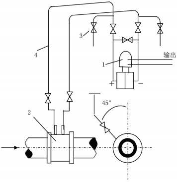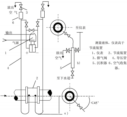 測(cè)量液體流量時(shí)工藝管道水平安裝,差壓變送器的位置 處于節(jié)流裝置下方時(shí),取壓口應(yīng)在節(jié)流裝置的水平中心 軸線下偏45°角引出,這可以消樣除由流體傳放出的氣體進(jìn)入導(dǎo)壓管和差壓變送器。若差壓變送器處于節(jié)流裝置的上方時(shí),除取壓口下偏<45°角然后向 上引導(dǎo)壓管外,應(yīng)在導(dǎo)壓管 上的*高點(diǎn)裝置集器或排氣閥。