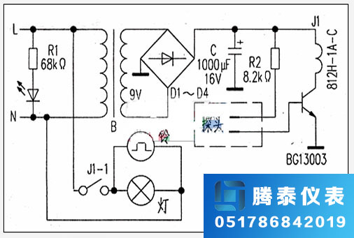 市電通過變壓器B與二次電源耦合。經(jīng)過整流濾波后,電容器C兩端產(chǎn)生12V直流電壓。該電壓通過繼電器線圈施加到三極管集電極上