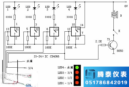 該電路由四路模擬開關(guān)IC CD4066組成。每個電路有四個獨立的開關(guān),可以控制數(shù)字或模擬信號的傳輸。水箱無水時,由于180K電阻的作用,四個開關(guān)的控制端為低電平,開關(guān)為off,LED不亮