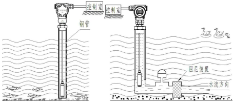 2、測(cè)量流水中的水位時(shí),當(dāng)介質(zhì)波動(dòng)較大時(shí),可在水道中插入內(nèi)徑約5cm的鋼管或PVC管,在水流方向相反的方向上,可以在不同的高度打開幾根管道Φ 5個(gè)小孔,允許水進(jìn)入管道,并將電纜和接線盒固定在管道出口處