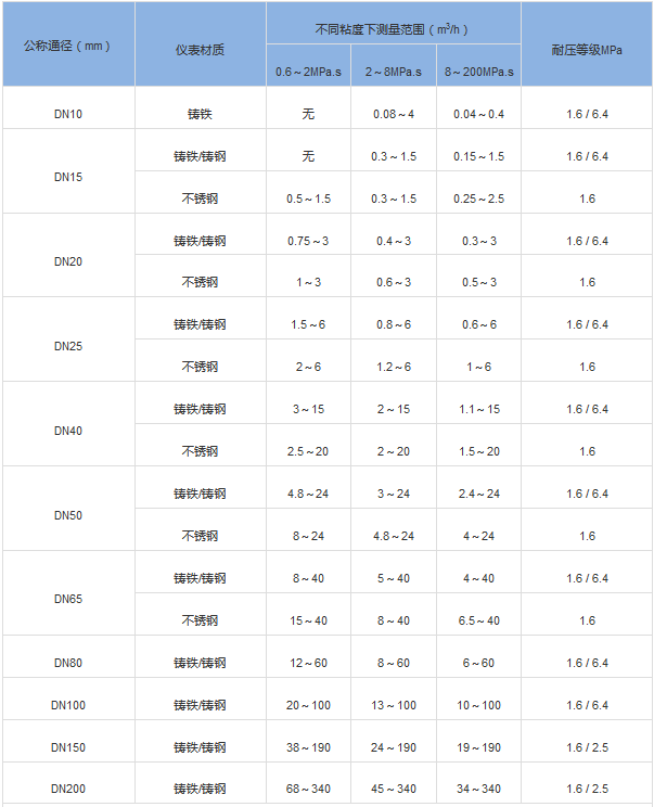 四、橢圓齒輪流量計(jì)測(cè)量范圍及工作壓力