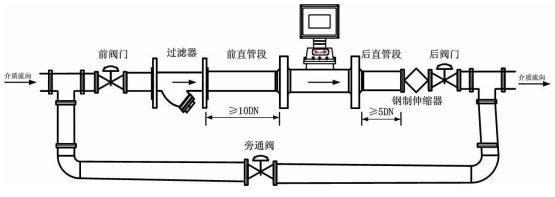 2、單向流情況下,超聲流量計(jì)前直管段的長度至少要求10 倍的公稱通徑(DN),后直管段長度至少要求5 倍的公稱通徑(DN)。雙向流情況下,超聲流量計(jì)的前后直管段的長度至少要求10 倍的公稱通徑(DN)。