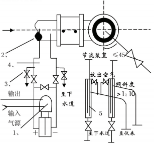 丈量液體流量時工藝管道水平安裝,差壓變送器的位置 處于節(jié)流裝置下方時,取壓口應(yīng)在節(jié)流裝置的水平中心 軸線下偏45°角引出,這可以消樣除由流體傳放出的氣體進(jìn)入導(dǎo)壓管和差壓變送器。若差壓變送器處于節(jié)流裝置的上方時,除取壓口下偏<45°角然后向 上引導(dǎo)壓管外,應(yīng)在導(dǎo)壓管 上的*高點(diǎn)裝置集器或排氣閥。