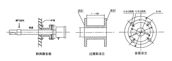 4、爐墻上的氧化鋯探頭固定法蘭裝置時(shí),用鋼材做成如圖外形的過渡架,過渡架的法蘭能直接焊在爐墻處壁上或埋入爐墻中,但請求氣密結(jié)實(shí)。過渡架另一端法蘭是為固定氧化鋯探頭而設(shè),因而必需與氧化鋯探頭固定法蘭的螺孔相匹配。如選用由12mm裝置孔,則將過渡架法蘭的¢125mm圓上均布四個(gè)¢12mm的裝置孔,運(yùn)用4個(gè)M1O×40的螺絲,將它與檢測器的固定法蘭緊固,為避免漏氣,兩法蘭間可填充橡膠紙板密封圈。