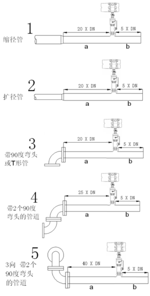 選擇程度直管段裝置,裝置點表前和表后的直管段請求為:裝置點上游的節(jié)流元件距裝置點必需大于 5 倍管道直徑,裝置點下游的節(jié)流元件距裝置點必需大于 3 倍管道直徑,有條件的狀況我們倡議盡量使表前表后直管段長些。