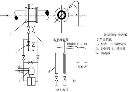 丈量蒸汽流量時,裝置方式普通為差壓變送器低于、高于節(jié)流安裝兩種。取壓口位置應(yīng)附合上述裝置請求,并在導(dǎo)壓管制高點(diǎn)處裝上放氣閥和氣體搜集器。