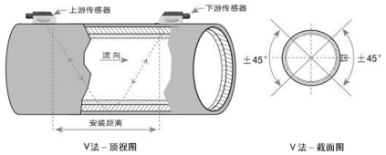 DN15~200mm的管道優(yōu)先選用V法,裝置時兩傳感器程度對齊,其中心線與管道軸線平行即可,并留意發(fā)射方向一定相對(兩個傳感器方向朝里)。V法具有運用便當,丈量精確的特性。關(guān)于口徑小于DN50mm的管道裝置精度較高,請留意信號強度、信號質(zhì)量、傳輸時間比這幾個參數(shù)。