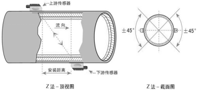 DN200~6000mm的管道優(yōu)先選用Z法,在V法測不到信號或信號質(zhì)量差時也可選用Z法。裝置時讓兩個傳感器之間沿管軸方向的垂直間隔等于裝置間隔,并且保證兩個傳感器在同一軸面上即可,并留意發(fā)射方向一定相對(兩個傳感器方向朝里)。由于Z法是超聲波在介質(zhì)傳播中直接納發(fā),信號沒有反射,因此信號強度衰減*小。所以,Z法信號強度較高,適用于口徑較大、介質(zhì)含雜質(zhì)或氣泡、管道有結(jié)垢等超聲波信號衰減較大的場所。